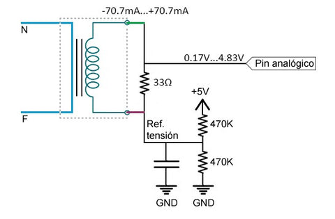 在SCT013-000的情况下,输出将为±50mA。外部负载电阻33Ω,输出电压RMS为±1.65V,峰值电压为±2.33V,峰间电压为4.66V。