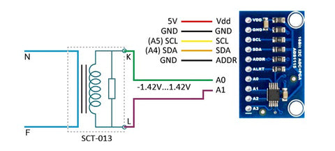 目前我们已具备使用SCT-013传感器测量电网电流的全部组件。我们将采用带电压输出(±1V RMS)和内置负载电阻的传感器,并配合ADS1115模数转换器工作在差分模式下。