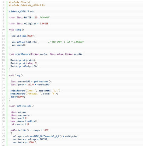 若使用输出为±1V RMS的SCT013传感器配合ADS1115模块,所需代码与我们在ADS1115专题中介绍的示例代码类似。您需要调用Adafruit专为ADS1115开发的库函数进行编程。